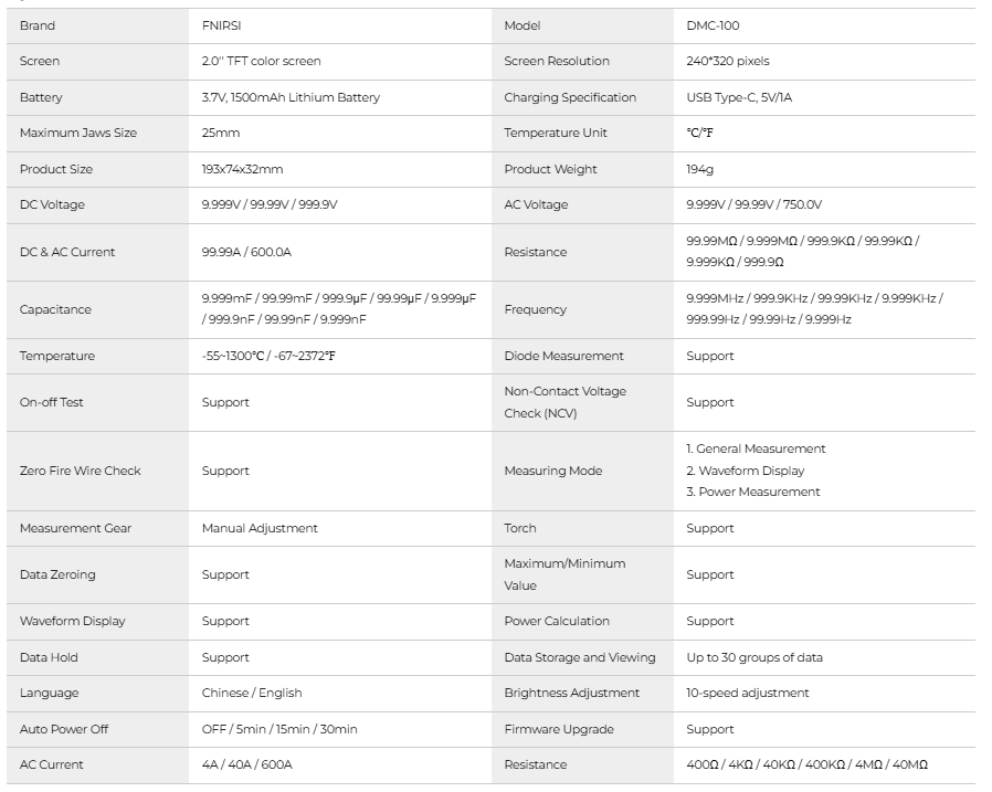 FNIRSI DMC-100 is a 10,000-count high-precision intelligent clamp meter, covering 750V voltage and 600A current ultra-wide range, whether it is engineering maintenance, laboratory research, or vehicle overhaul, home electrical diagnostics, can be easy to handle.