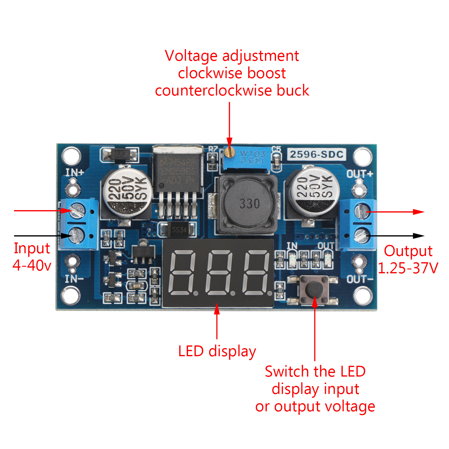 - Output Voltage: 1.25V – 37V (continuously adjustable, the input voltage must be 1V higher than the output voltage)